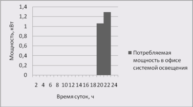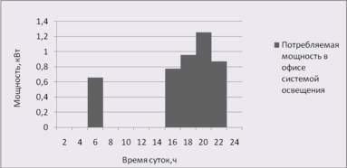 Суточный график использования фактической мощности системой освещения офиса характеризуется двумя пиками - утренним и вечерним.