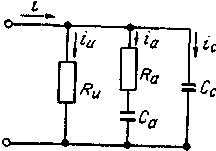 Для изучения перечисленных процессов используют схему замещения изоляции, показанную на рисунке 1, а. Резистор Ru характеризует сопротивление сквозному току; конденсатор С а - емкость, обусловленную дипольной поляризацией; конденсатор Сс - емкость электронной поляризации (геометрическая емкость); резистор эквивалентные потери при дипольной поляризации. На рисунке 1,6 показаны зависимости токов, проходящих через изоляцию, от времени нахождения под постоянным напряжением. Как видно, ток абсорбции затухает по мере завершения процессов замедленной поляризации, а ток сквозной проводимости сохраняется неизменным. Токи смещения столь кратковременны, что их не учитывают. Суммарный ток I имеет затухающий характер.