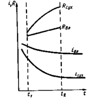 Определение увлажненности изоляции по коэффициенту абсорбции. Пусть изоляция некоторого электрооборудования, например электродвигателя, моделируется схемой замещения (см. рис. 1,а). Из предыдущего рассмотрения процессов электропроводности и поляризации следует, что для заведомо сухой изоляции в процессе измерения суммарный ток icyx будет резко затухать (рис. 2). У влажной изоляции такого же двигателя суммарный ток iвл больше и будет затухать медленнее, потому что из-за увлажнения прирост тока сквозной проводимости больше, чем прирост тока абсорбции. Описанный характер изменения суммарного тока определяет динамику сопротивления изоляции. При постоянном напряжении мегомметра сопротивление сухой изоляции Rсух при измерении будет резко увеличиваться, а сопротивление влажной Rвл будет возрастать незначительно. Следовательно, по состоянию сопротивления изоляции в зависимости от продолжительности измерения можно определить, увлажнена изоляция или нет.
