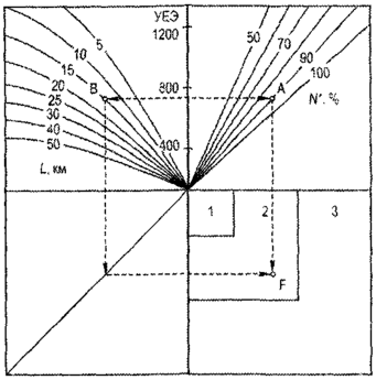На оси ординат откладывают объем работ ЭТС и из точки О проводят линию до пересечения с лучом N*, соответствующим обеспеченности хозяйства электромонтерами.
