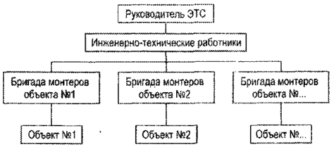 Территориальная структура ЭТС приведена на рис.3. В ее основе лежит распределение исполнителей по объемам хозяйства (отделениям, бригадам, фермам). При этом выделенные группы исполнителей осуществляют все эксплуатационные работы, но только на своих участках.