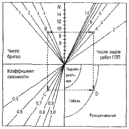 Например, в период подготовки ферм к зимовке скота ЭТС имеет функциональную структуру, а в период зимовки территориальную структуру. Возможны и другие перестройки службы в зависимости от годовой программы и графика ТР. Обоснование структуры ЭТС выполняется графическим методом по номограмме, приведенной на рис. 4 [5].