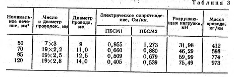 На контактных сетях применяют сталемедные провода марок первого класса ПБСМ1 и второго класса ПБСМ2 (см. табл.3).