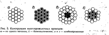 Конструкции многопроволочных проводов показаны на рис.5. Провода из проволок одного металла марок М, Бр, С показаны на, рис.5, а; биметаллические из проволок, имеющих сердцевину из одного металла, а оболочку из другого металла - сталемедные и сталеалюминиевые марок ПБСМ и ПБСА, - на рис.5, б; комбинированные марок АС и АПБСА - на рис.5, в и г.
