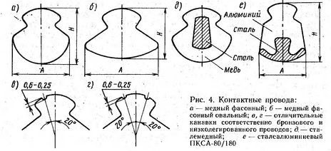 Для отличия от медных на верху бронзовых контактных4 проводов имеется одна канавка (рис.4, в), а на верху низколегированных - две симметрично расположенные канавки (рис.4, г).