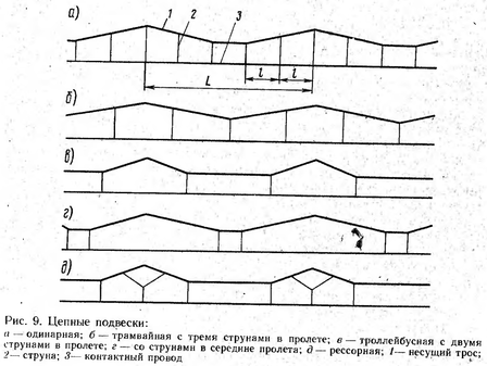 Цепные подвески (рис.9) применяют для обеспечения нормального токосъема при повышенных скоростях движения. Характерной их особенностью является подвеска контактного провода к продольному несущему тросу, которой закрепляется на опорных конструкциях. Длина пролета Ь Между точками закрепления троса на опорных конструкциях, по сравнению с простой подвеской, значительно увеличивается и вместе с тем длина пролетов между точками закрепления провода на несущем тросе (струновые пролеты) уменьшается. Провес контактного провода при этом уменьшается, и контакт между проводом и токоприемником улучшается, что особенно необходимо при больших скоростях движения.