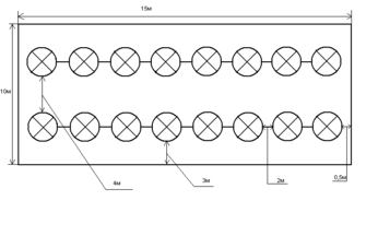 Расстановка в два ряда, с расстоянием между рядами 4метра,от торцов камеры отступаем 0,5метра, с шагом расстановки 2метра, длина камеры 15метров, ширина 10метров.