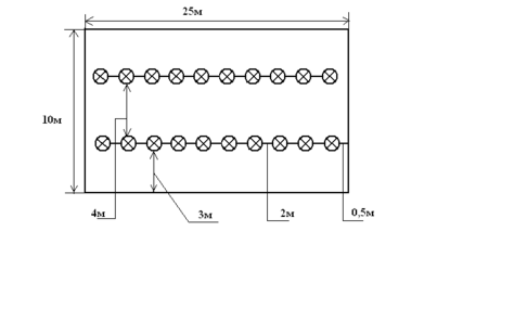 Выполним расстановку светильников на кровле комплекса рудоспуска, что укажем на эскизе / лист 16,рисунок 3 /. Расстановка в два ряда, с расстоянием между рядами 4метра, от торцов помещения отступаем 0,5метра, с шагом расстановки 2,5метра. Потребляемая мощность светильников рудоспуска Р = Рл × Nсв = 100 × 20 = 2000Вт = 2кВт.
