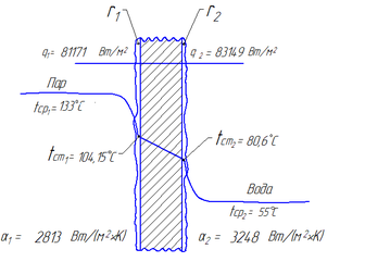 Сравнивая (q1)I с (q2)I, приходим к выводу, что 91571,5>>52088, поэтому расчет температуры стенки продолжаем, задаваясь другим значением температуры стенки со стороны пара.