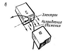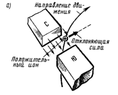 Рисунок 1.1 – Схемы действия магнитного поля на движущиеся электрические заряды: положительный ион (а) и электрон (б).