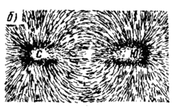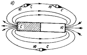 Графически магнитное поле изображают магнитными силовыми линиями, которые проводят так, чтобы направление силовой линии в каждой точке поля совпадало с направлением сил поля; магнитные силовые линии всегда являются непрерывными и замкнутыми. Направление магнитного поля в каждой точке может быть определено при помощи магнитной стрелки. Северный полюс стрелки всегда устанавливается в направлении действия сил поля. Конец постоянного магнита, из которого выходят силовые линии соответствии с рисунком 1.2-а, принято считать северным полюсом, а противоположный конец, в который входят силовые линии, – южным полюсом.