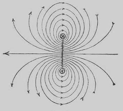 Если проволока навита спирально вокруг кругового цилиндра (соленоид), то поле внутри её состоит из пучка почти параллельных и равномерно густо расположенных линий сил, расходящихся по мере приближения к концу соленоида и охватывающих его со всех сторон; линии сил в одной из плоскостей сечения соленоида, проходящей через его ось располагаются в соответствии с рисунком 2.3.