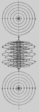Если проволока представляет не прямую, а какую-нибудь линию в плоскости или пространстве, то характер поля её вообще будет иной, зависящий от формы проволоки. Так, если проволока согнута в плоское кольцо, то расположение линий сил будет таково, какое показано в одной из диаметральных плоскостей кольца в соответствии с рисунком 2.2.