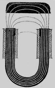 Так, например, если бы мы желали достичь индукцию В = 12000 в электромагните в соответствии с рисунком 2.7 с железным путем в 30 см, и нам известно было бы, что при данной индукции проницаемость железа μ = 900, то, согласно (2.11), нам потребовалось бы для этого 0,8 (12 000/900) 30 = 320 ампер-оборотов, т.е. обмотку в 320 оборотов, до которой проходил бы ток в 1 ампер, или обмотку в 160 оборотов и ток в 2 ампера и т.д.