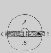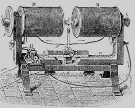 Катушки N и M создают поток, который замыкается через железные бока и основание рамы ОКО'; поле создается в пространстве с. Сердечники N и M просверлены и снабжены по концам никелевыми призмами а и b для наблюдений над магнитным вращением плоскости поляризации в веществах, помещенных в поле. H – коммутатор, посредством которого можно менять направление тока в обмотке электромагните и тем самым изменять направление потока и поля в пространстве с.