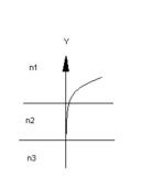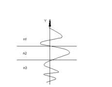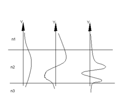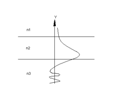 Основні результати аналізу. У системі, що складається із трьох діелектричних шарів з показниками переломлення n1, n2, n3 за умови n2>n1, n2>n3 можливе поширення хвилі уздовж шару 2, при цьому розподіл електромагнітного поля в поперечному перерізі має максимальне значення усередині центрального шару 2 (можливе існування декількох максимумів) і експоненциальне спадає при видаленні від границь шару 2 у напрямку осі ОУ (або - ОУ). Хвиля з неоднорідним розподілом по координаті в поширюється уздовж площини хвилеводу й характеризується постійної поширення