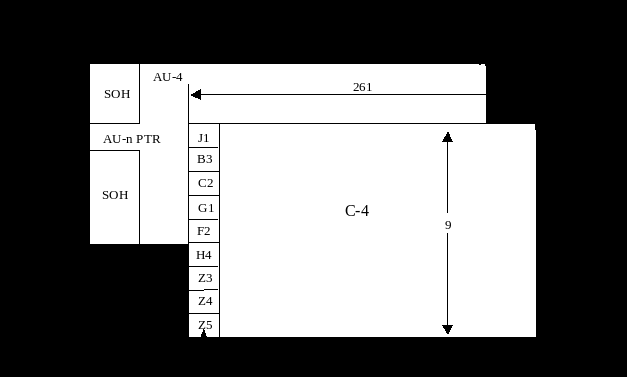 Первые 9 столбцов цикла STM-1 занимают служебные сигналы: секционный заголовок (SOH), который состоит из заголовка регенерационной секции RSOH (первые три ряда) и заголовка мультиплексной секции MSOH (последние 5 рядов) и указателя административного блока (AU-указателя), т.е. указателя позиции первого байта цикла нагрузки. Остальные 261 столбец отводятся для нагрузки.
