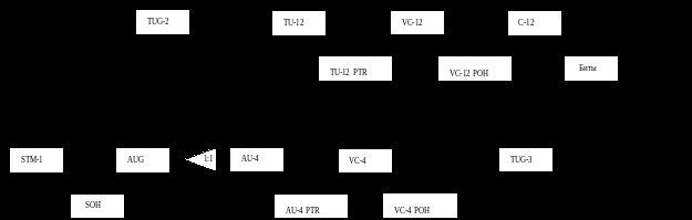 STM-1=(((E1++VC-12_POH+TU-12_PRT)x3TUG-2)x7TUG-3+NPI+ +FSTUG-3)x3VC-4+VC-4_POH+FSVC-4+AU-4_PTR)x1AUG+RSOH+MSOH