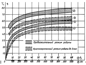 Рис. 3.1. Кривые КПД малых машин постоянного тока в зависмости от полезной мощности на валу