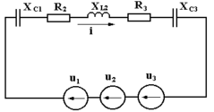 i=7Sin(t+130)+1,2Sin(2t-860)+0,4Sin3t A, що на схемі заміщення представляємо як послідовно з'єднані три джерела змінної напруги u1, u2 і u3 c різними частотами (малюнок 11)