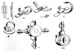 а) металлическая или пластмассовая деталь; б) деталь с перфорированной пластмассовой лентой; в) скобка с полоской; г) скобка с перфорированной лентой; д) пластмассовая штампованная деталь; е) крепление коробки приклеивания;