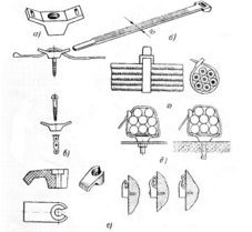 Распорные дюбеля и дюбеля, забиваемые ручной или пиротехнической оправкой и встреливаемые пистолетом, позволяют крепить детали с минимальной затратой времени. Помимо распорных металлических дюбелей с волокнистым заполнителем и с конической гайкой, используют капроновые дюбеля. Преимущество капроновых дюбелей устойчивость к динамическим нагрузкам и вибрации, высокая устойчивость против коррозии, возможность применения во влажных и химически активных средах.