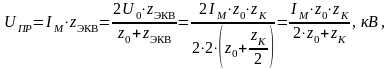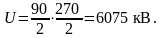 Считая, что при ударе в провод действительный ток вдвое меньше статического, а эквивалентное волновое сопротивление двух проводов вдвое меньше сопротивления одного провода, определим амплитуду волны перенапряжения, распространяющейся по проводу в обе стороны и достигающей гирлянды: