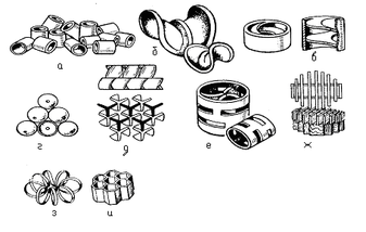 Рис. 1. а – кольцевая керамическая; б – седла Берля; в – кольца с перегородками; г – шары; д – пропеллерная насадка; е – кольца Палля; ж – хордовая насадка; з – спираль; и – керамические блоки