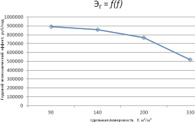 По результатам расчетов строим графики зависимости годового экономического эффекта и срока окупаемости от удельной поверхности насадки