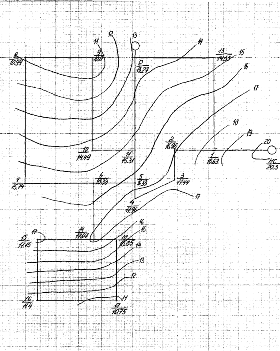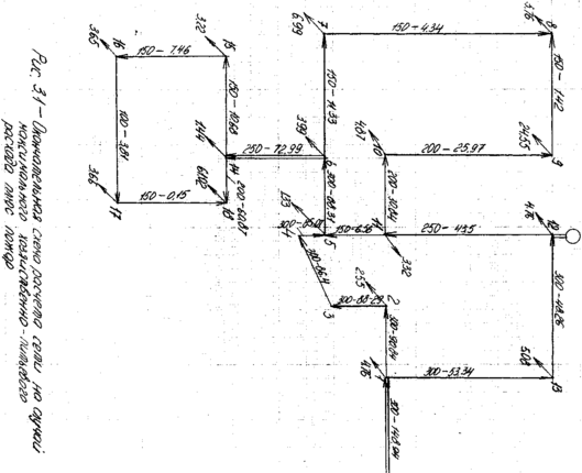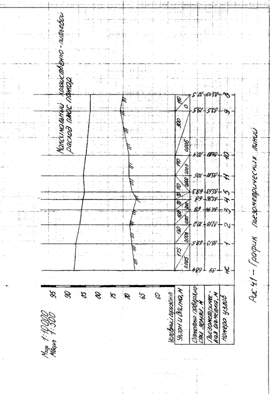 Пьезометрическая отметка точки 9 складывается из отметки поверхности земли и свободного напора. Пьезометрическая отметка следующей точки определяются как сумма или разность (в зависимости от направления потока) известной пьезометрической отметки предыдущей точки (обе точки должны находиться на одном участке) и потерь напора на участке и т.д.