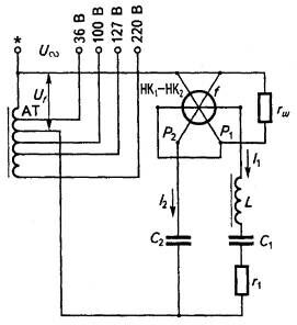 Схему одного з переносних частотомірів, що виробляються в Україні, зображено на рис.4. На схемі позначено: Р1 і Р2 - обмотки рухомих рамок приладу, жорстко закріплених на осі рухомої системи під прямим кутом одна до одної; НК1 і НК2 - обмотки нерухомих котушок; L - котушка індуктивності з феромагнітним осердям, що має невеликий повітряний проміжок; С1 - конденсатор, який створює резонансний контур з котушкою L; r1 - додатковий опір, rш - підгінний опір; С2 - конденсатор, реактивний опір якого обмежує величину струму, що проходить через обмотку рамки Р2; AT - автотрансформатор, що дає можливість при величинах номінальних напруг контрольованої частотоміром мережі 36, 100, 127 або 220 В подавати на вимірювальний механізм певну величину напруги, на якій проводилось градуювання приладу. Зауважимо, що відхилення величини напруги мережі у межах ±10 % від її номінальної величини викликає лише невелику додаткову похибку у показаннях, яка не виходить за межі, допустимі для класу приладу. Частотоміри за наведеною схемою виробляють у декількох модифікаціях. Всі пі прилади здатні вимірювати частоти від 45 до 1650 Гц. Діапазон вимірювань частоти кожним з цих приладів відповідає ±10 % від значення середньої частоти, вимірюваної даним приладом, тобто від 45.55 до 1350.1650 Гц.