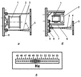 У разі відхилення вимірюваної частоти від середини діапазону змінюються опори реактивних елементів ХС1=l/2πfxC1, ХС2= l/2πfxC2, XL2=l/2πfxL2 і співвідношення між струмами в котушках, унаслідок чого стрілка відхиляється на кут, пропорційний вимірюваній частоті fx. Аналогічно працює й електромагнітний частотомір.