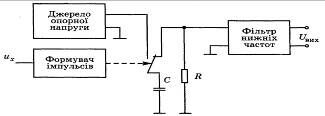 Вимірювальний перетворювач частоти в напругу становить основу так званого конденсаторного частотоміра, спрощену схему якого наведено на рисунку 6. Періодичний сигнал із частотою fx надходить на вхід формувача прямокутних імпульсів, частота яких дорівнює вимірюваній частоті. Прямокутні імпульси діють на перемикач, який з'єднує конденсатор із джерелом стабільної напруги. Упродовж часу тривалості імпульсу Ті конденсатор заряджається до напруги U0. Заряд, який накопичився за цей час на обкладках конденсатора, становитиме: Q=U0C.
