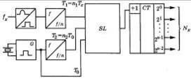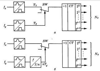 Якщо ж частоти fx і fy близькі за значенням, то імпульси з частотою fy після формувача (рис.8, б) подаються на подільник частоти з коефіцієнтом ділення n. Числовий відлік лічильника імпульсів у такому разі дорівнюватиме: