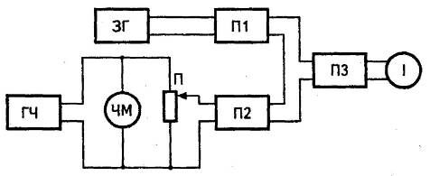 ЗГ - генератор зразкової частоти; ГЧ - генератор змінної частоти живлення приладу; ЧМ - частотомір, що повіряється; П1, П2, П3 - підсилювачі; І - індикатор наявності коливань напруги; П - потенціометр.