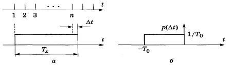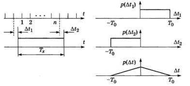Оскільки вимірювана величина до вимірювання невідома, то кінець інтервалу Тх може з однаковою ймовірністю припасти на будь-який момент між сусідніми квантувальними імпульсами, тому похибку квантування Δt вважають випадковою і розподіленою за рівномірним несиметричним законом з граничним значенням Т0 (рис.10, б). Математичне сподівання похибки квантування дорівнює T0/2, а середнє квадратичне відхилення σ=Т0/√12. Синхронізувати генератор квантувальних імпульсів з початком вимірюваного інтервалу Тх часто не вдається, тому похибка квантування виникає на початку Δt1 і в кінці Δt2 вимірюваного інтервалу часу Тх (рис.11). Похибки Δt1 і Δt2 розподілені за рівномірними несиметричними законами з граничним значенням Т0. Сумарна похибка квантування Δt=Δt1+Δt2 розподілена за трикутним законом (законом Сімпсона) з граничним значенням Т0. Математичне сподівання сумарної похибки квантування дорівнює нулю, а середнє квадратичне відхилення σ=Т0/√6.