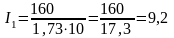 Определяется номинальный ток в линии электроснабжения I1,А: