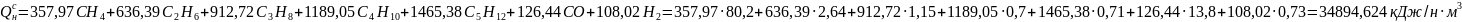 где 357,97; 636,9;… — низшая теплота сгорания 1% сухой массы соответственно метана, этана, … в процентах по объему.
