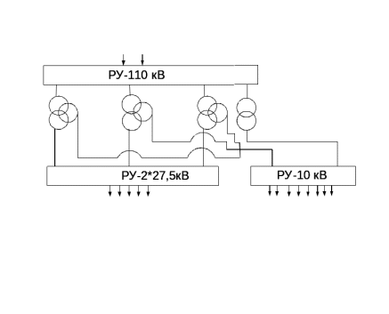 Наиболее экономичная схема подстанции для совместного питания районных и тяговых потребителей получается при использовании трёхобмоточных однофазных трансформаторов. В этой схеме трансформаторы 1,2,3 и 4 подключают к первичным шинам 110 кВ по схеме полного треугольника, для тяги используют вторичные обмотки трансформаторов , обмотки всех трёх трансформаторов соединяют в звезду для питания района. Трансформатор 4, питающий только район, является резервным для тяги и поэтому должен иметь три варианта подключения к шинам первичного напряжения 110 кВ и два варианта подключения к РУ 2×25 кВ. При выходе из строя одного из тяговых трансформаторов заменяет его трансформатор 4, а район в это время питается с ухудшенным качеством напряжения.