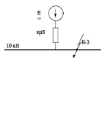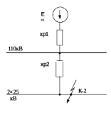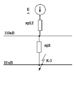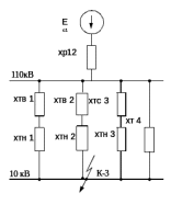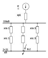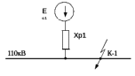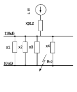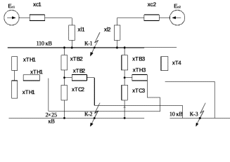 По расчётной схеме составляется электрическая схема замещения (рис.6), на которой все элементы представляются в виде сопротивлений. Сопротивления схемы замещения считаются чисто индуктивными, т.к. в высоковольтных цепях активные сопротивления много меньше индуктивных.