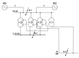 Составляем расчётную схему цепи к.з.. Для этого заданную схему внешнего электроснабжения дополняют схемой ТП, на которой указывают понижающие трансформаторы, преобразовательные агрегаты и шины всех РУ. Схему составляем для максимального расчётного режима, т.е. учитываем параллельную работу понижающих трансформаторов.