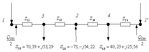 Для расчёта установившегося режима составим схему замещения электрической сети с мощностями узлов, приведёнными к стороне ВН. (рис.11)