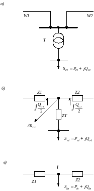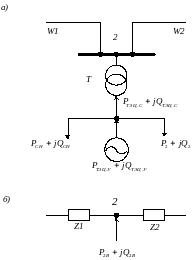 На рис.9а показан участок схемы электрической сети: две линии W1 и W2 подходят к некоторому узлу i. Нагрузка на стороне НН составляет