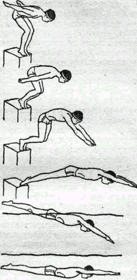 Вход в воду и скольжение. Тело входит в воду в выпрямленном положении под углом 20—30°. Такой угол обеспечивает наименьшую глубину погружения (40—60 см) пловца в воду, наибольшую скорость и длину скольжения. Скольжение представляет вогнутую пологую дугу, в которой тело вначале движется вперед и немного вниз, затем горизонтально, а далее, при всплывании, вперед и немного вверх.
