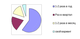 По результатам диаграммы можно сделать вывод о том, что в городе Екатеринбурге существует острая необходимость в предоставлении гостиничных услуг. 60% гостей города посещают гостиницы города Екатеринбурга 1-2 раза в год, 20% опрошенных – раз в квартал, 15 %- 1-2 раза в год и 5% чаще.