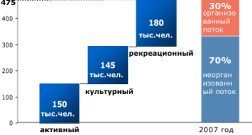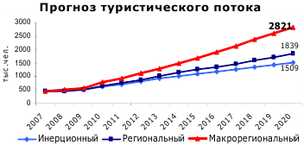 Далее приводятся основные прогнозные показатели турпотоков и количественный состав необходимой инфраструктуры (табл.3, рис.6).