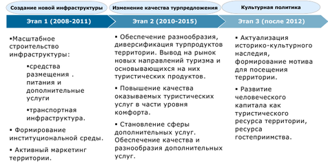 Территория, развивающая туризм, должна последовательно пройти каждый из трех этапов становления (табл.5), для реализации которого необходима разработка комплекса мер.