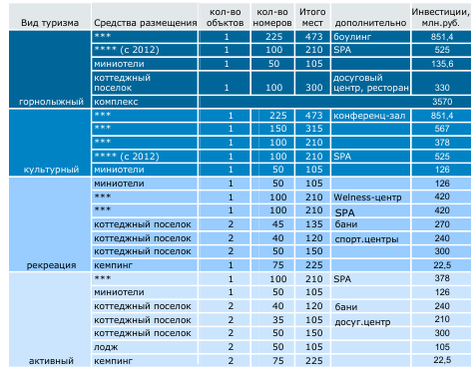 Согласно прогнозу турпотока и требований к размещению, в регионе необходимо строительство следующих видов средств размещения (табл. 6).