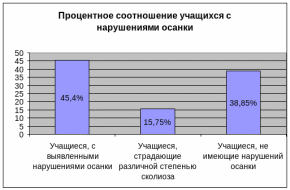 В результате анализа медицинских карт в Маркушевской средней общеобразовательной школе за 2007 год получили следующие данные: из 108 учащихся всей школы у 49 школьников выявлены нарушения осанки, что составляет 45,4% и 17 учащихся страдают различной степенью сколиоза, что составляет 15,75% от общего количества школьников, и только 38,85% без нарушения осанки.
