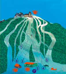 | Схема трасс | Цифрами на схеме обозначены: 1. Бугельный подъемник "Андрей"(750м). 2. Бугельный подъемник Бэби" (530м). 3. Бугельный подъемник «Бэби +» (530м). 4. Парнокресельный подъемник (950м). 5. Бугельный подъемник "Ганс" (800м). 6. Подъемник "Бублик" (210м). 7. Бугельный подъемник ВЛ 2000 (950м). |
